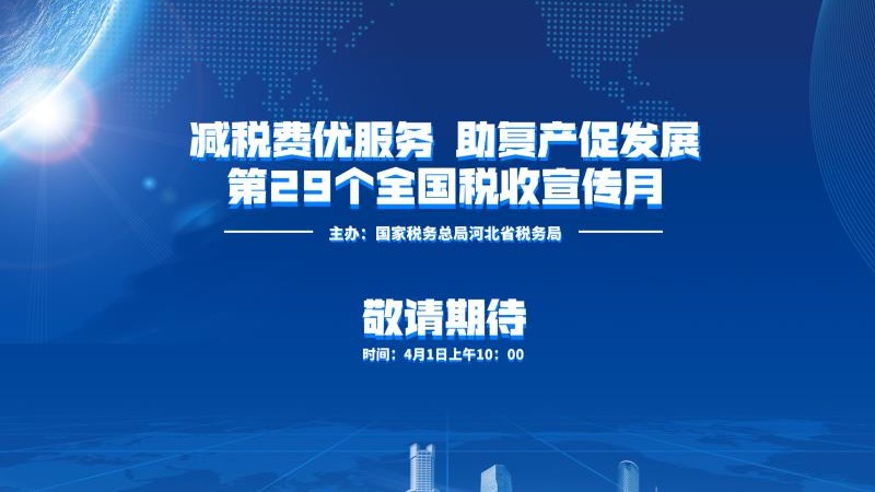 4月1日上午10:00,国家税务总局河北省税务局、长城新媒体集团联合举办的“‘减税费优服务 助复产促发展’暨第29个全国税收宣传月启动仪式”大型网络直播活动正式开播。活动现场,我们将邀请河北经贸大学财政税务学院教授古建芹、石家庄以岭药业股份有限公司总经理吴相君做客直播间,全方位对税收政策进行深度剖析。同时,还有河北省税务工作人员化身“主播”,以“云课堂”的方式教您“非接触式”办税。期待您的关注!