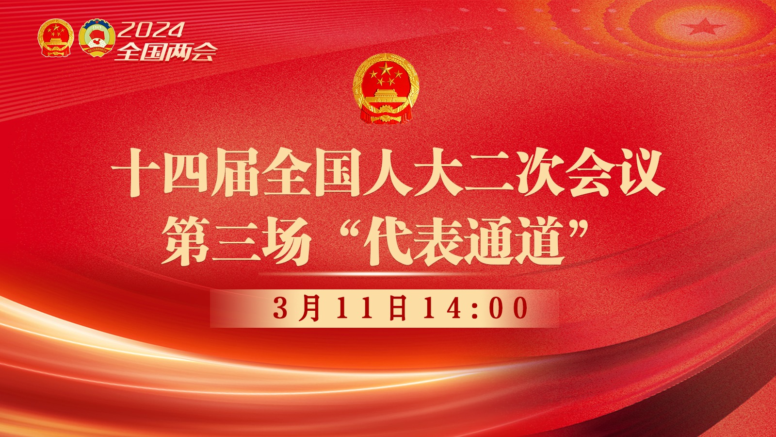 3月11日(星期一)下午2时,在人民大会堂中央大厅北侧举行十四届全国人大二次会议第三场“代表通道”集中采访活动,邀请部分全国人大代表接受采访。
