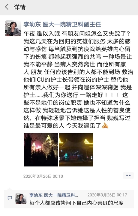 “一位ICU护士长告诉我,有患者去世后家人朋友都不在身边,孤零零一个离开这个世界。这个时候她们会代替亲人,在患者生命的最后一刻为他们送终,说我是护士某某、我来为你送行,希望你一路走好!