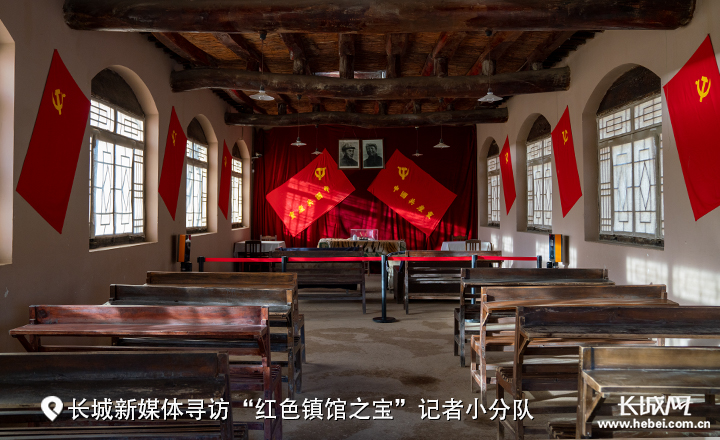 轻轻推开房门,会场正面悬挂着毛泽东主席、朱德总司令的画像和两面红旗,一排排长凳整齐地摆放着,让来访者不禁追忆起那时的场景。