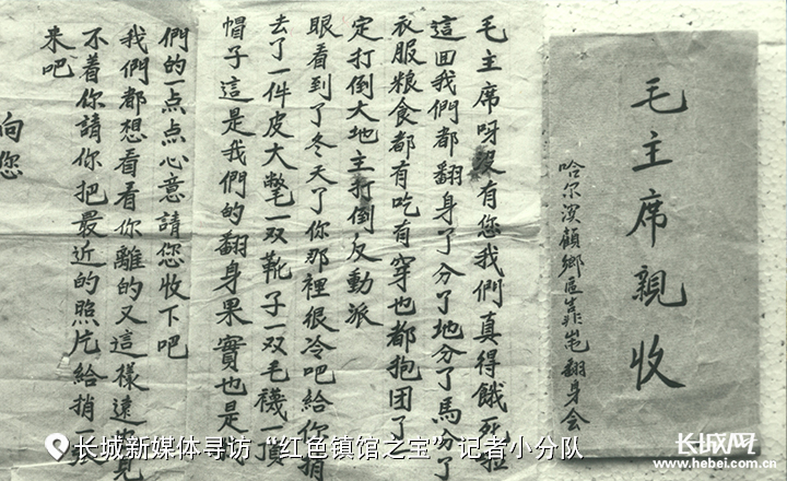 “毛主席呀,没有您,我们真得饿死了。这回我们都翻身了,分了地分了马分了衣服粮食。都有吃,有穿……”在西柏坡纪念馆里的第二展厅,有这样一封信在展柜中陈列着。信的落款写着——民国三十六年九月十日,哈尔滨市故乡区靠山屯全体翻身农民。泛黄纸张上朴实的言语表达了农民对毛主席和共产党的感激之情。