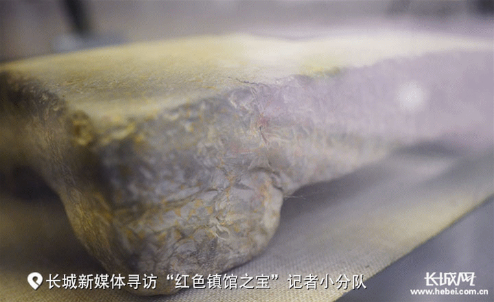 透过潘家峪惨案纪念馆的展区玻璃,依稀可以看到捶布石上的“痕迹”。