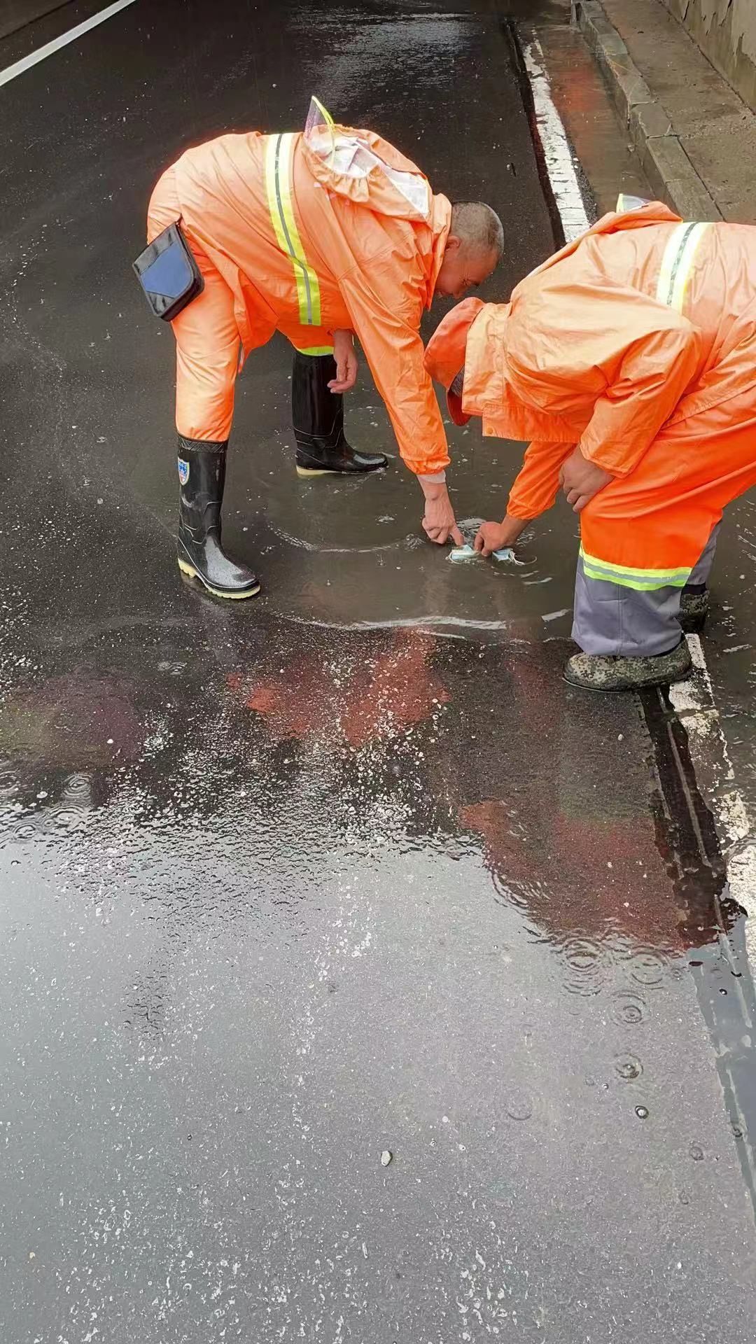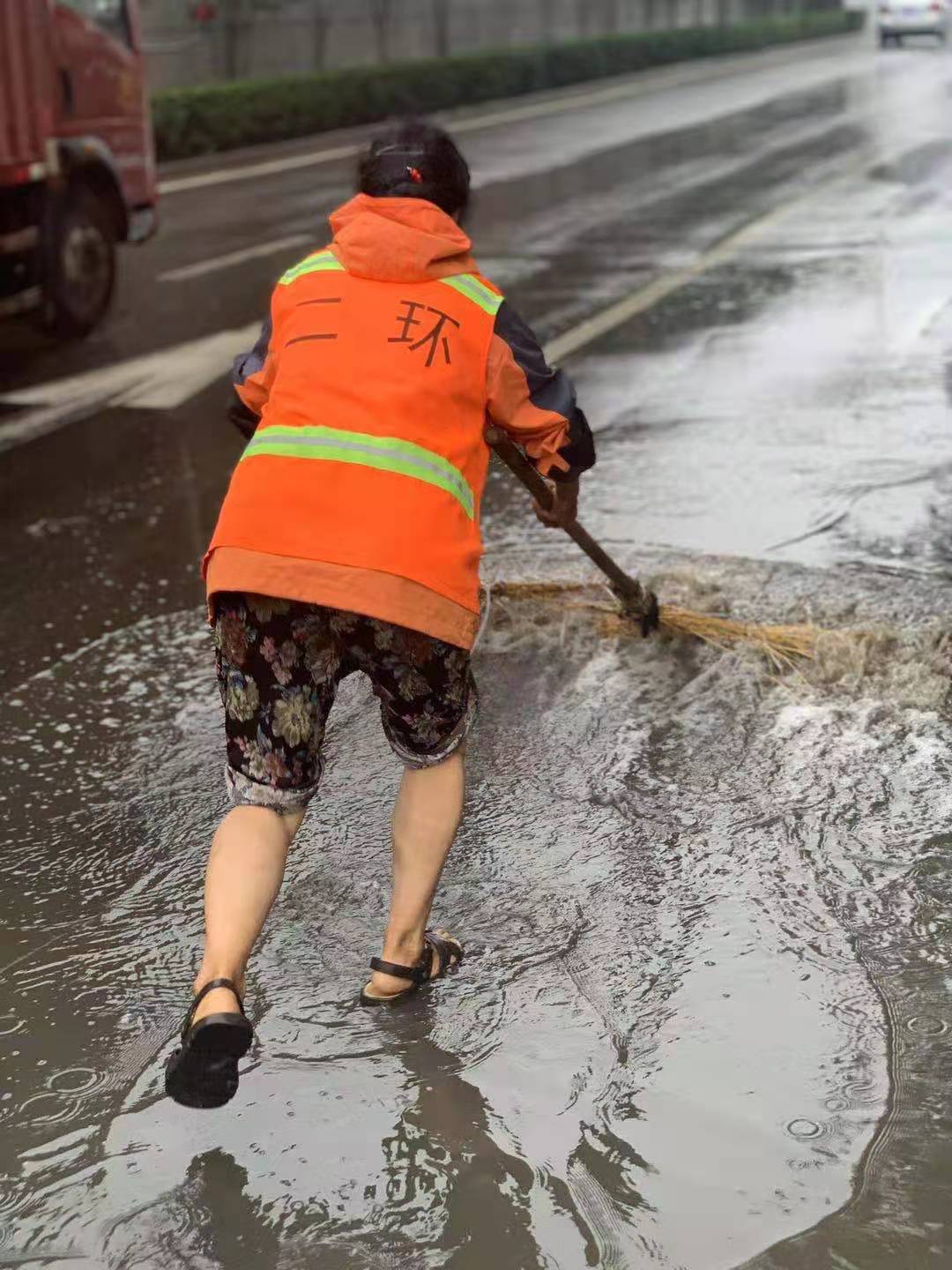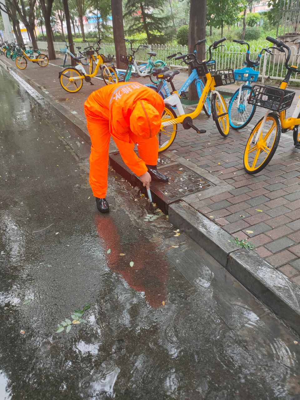 7月17日下午强降雨减弱后,市城管系统组织环卫工人抢抓时间,对路面进行及时清理。环卫工人抓紧清除路面上的落叶、淤泥、垃圾等杂物,防止后期雨情造成收水口堵塞,恢复市容市貌整洁;对部分低洼路面的积水开展推水作业,人工将积水推送至收水井口排出,方便群众和车辆通行,维护正常交通秩序。