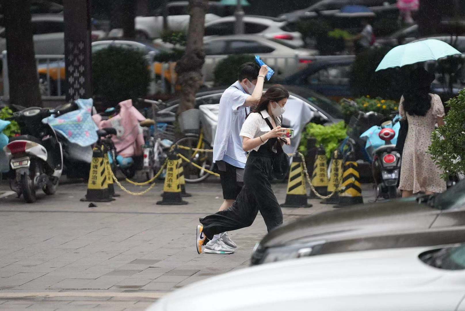 长安区北国商城附近,市民在雨中急行,目前雨量逐渐减小。(记者 李畅)