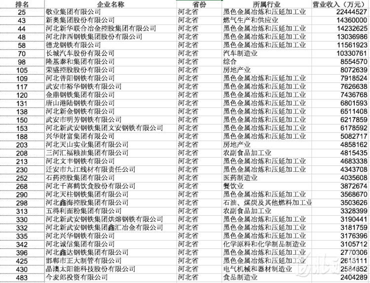 今天开幕的2021中国民营企业500强峰会上,发布了2021中国民营企业500强榜单,河北省有33家企业上榜。其中敬业集团有限公司、新奥集团股份有限公司、河北新华联合冶金控股集团有限公司,分别位列榜单第27、45、46位。
