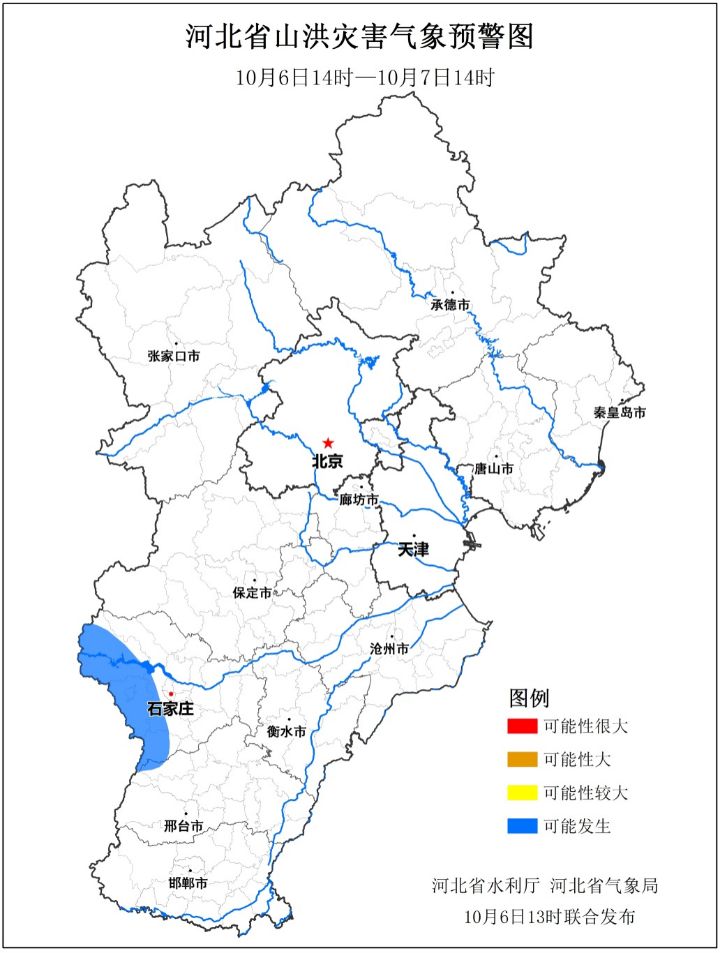 6日,降雨还将持续。河北省水利厅和河北省气象局10月6日13时联合发布山洪灾害气象预警:预计,10月6日14时至10月7日14时,石家庄市(井陉县、井陉矿区、平山县、赞皇县、元氏县、鹿泉区)、邢台市(临城县)等地局地可能发生山洪灾害(蓝色预警)。请上述地区注意做好实时监测、防汛预警和转移避险等防范工作。