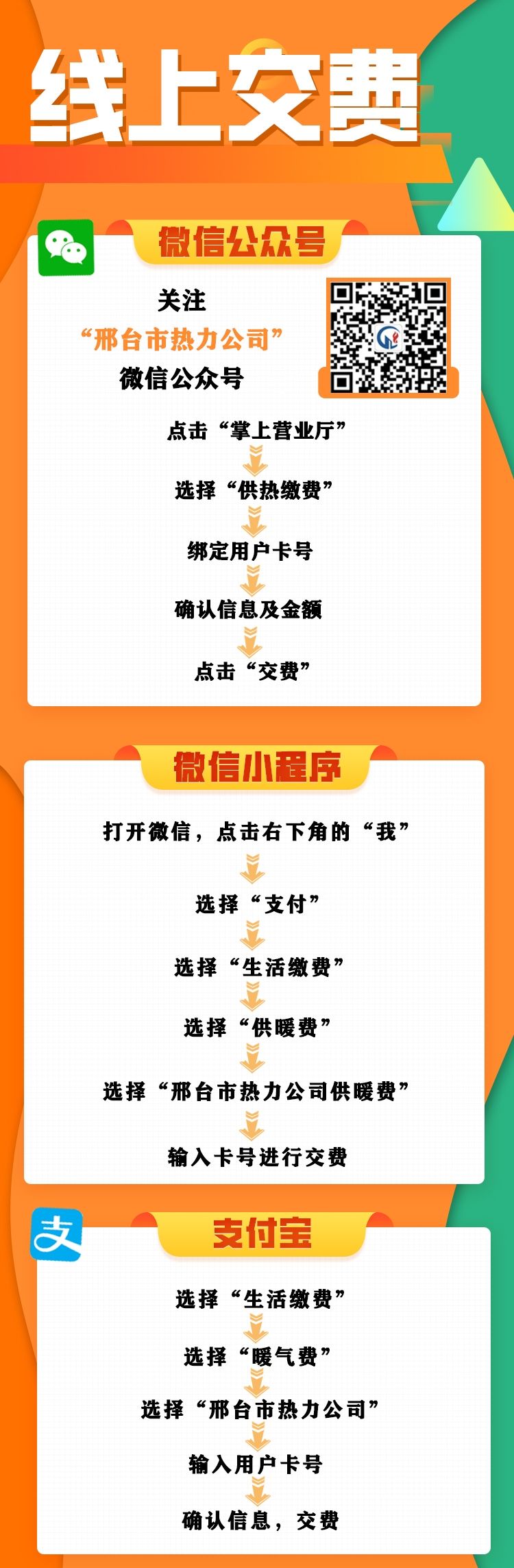 2、网上缴费时间:自10月3日上午10点起,可通过微信公众号“华能邯郸供热”手机缴费