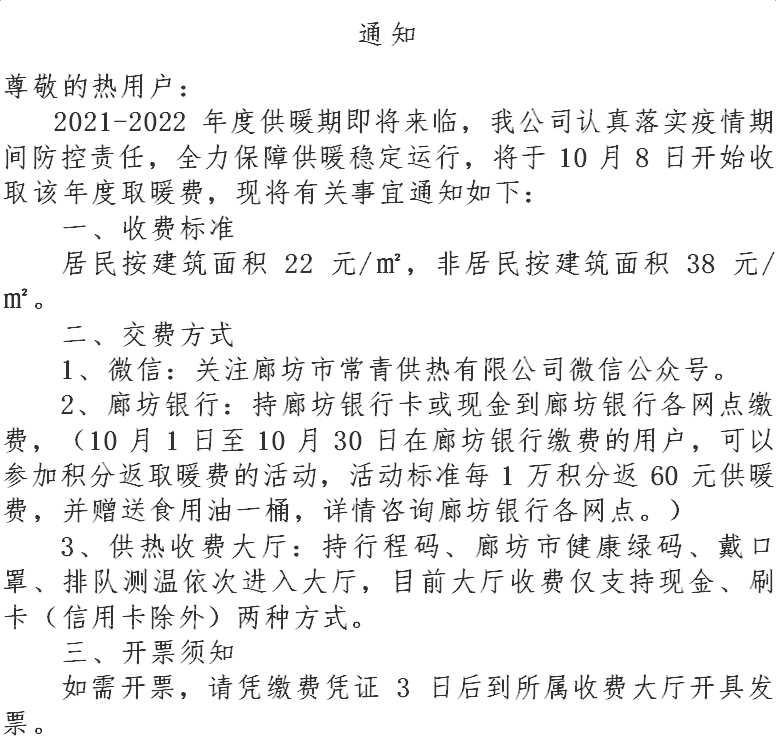 2021-2022采暖期即将开始,为保证您今冬正常用热,我公司定于2021年10月8日至11月14日收取本年度采暖费,逾期未缴费用户视为今冬不用热,届时将关闭阀门。现将本年度采暖季收费事宜通知如下