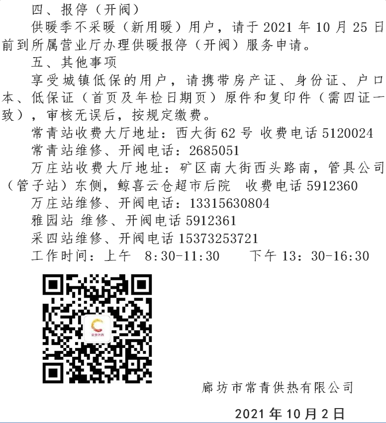 廊坊市常青供热有限公司最新发布通知,将于10月8日开始收取年度取暖费↓↓↓