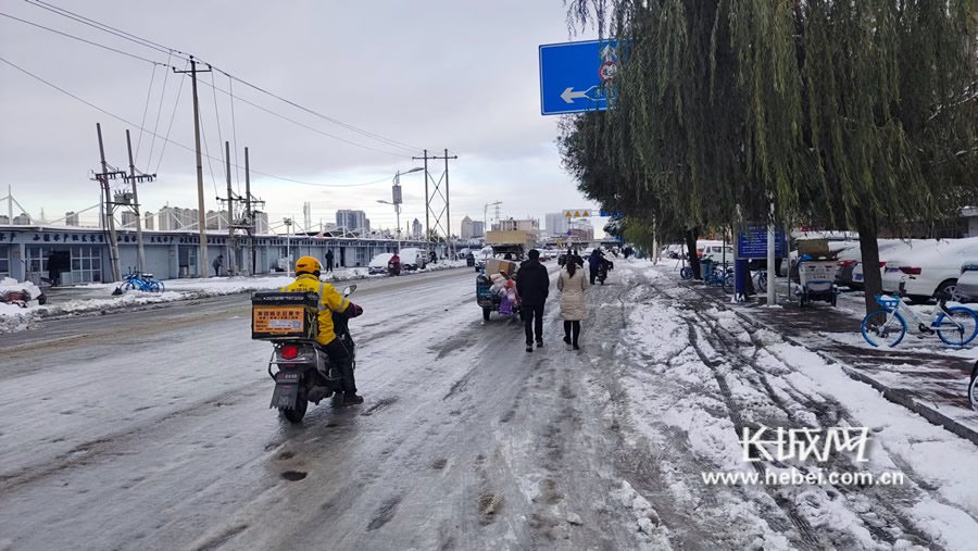 早8时,秦皇岛市部分路面出现结冰,不少市民选择步行或者公交车出行。(长城网·冀云客户端记者 武佩剑)
