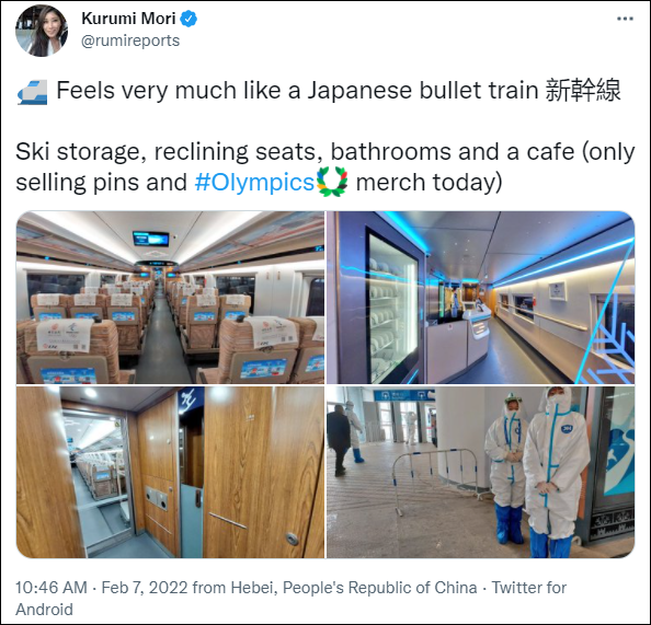 美国彭博社驻日本记者森来实由北京乘坐冬奥列车
